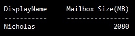 Get-Mailbox | Get-MailboxStatistics | Select-Object DisplayName,@{Expression={$_.TotalItemSize.Value.ToMB()};Label="Mailbox Size(MB)"}